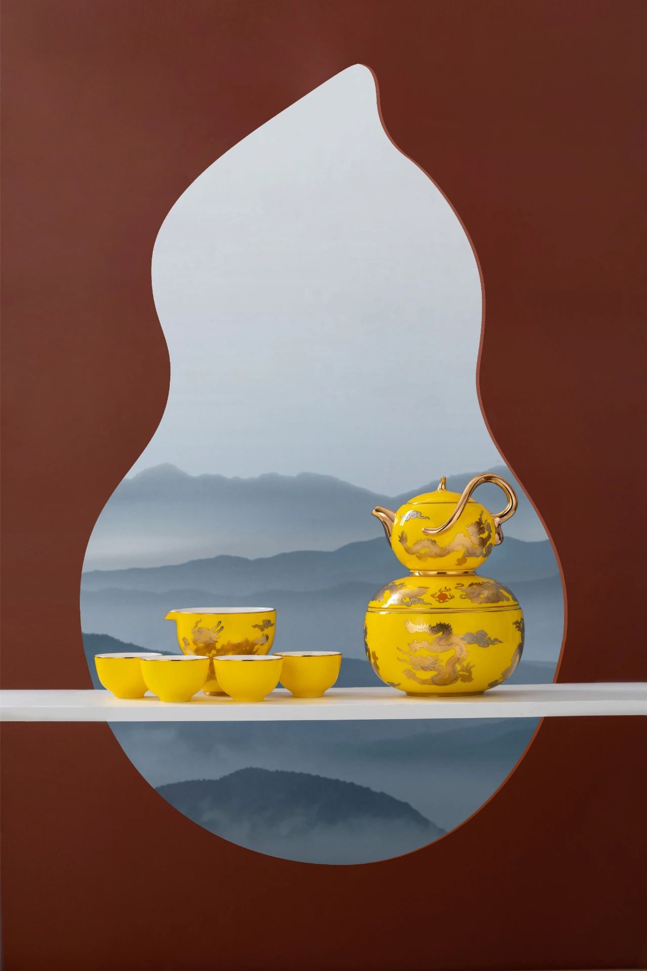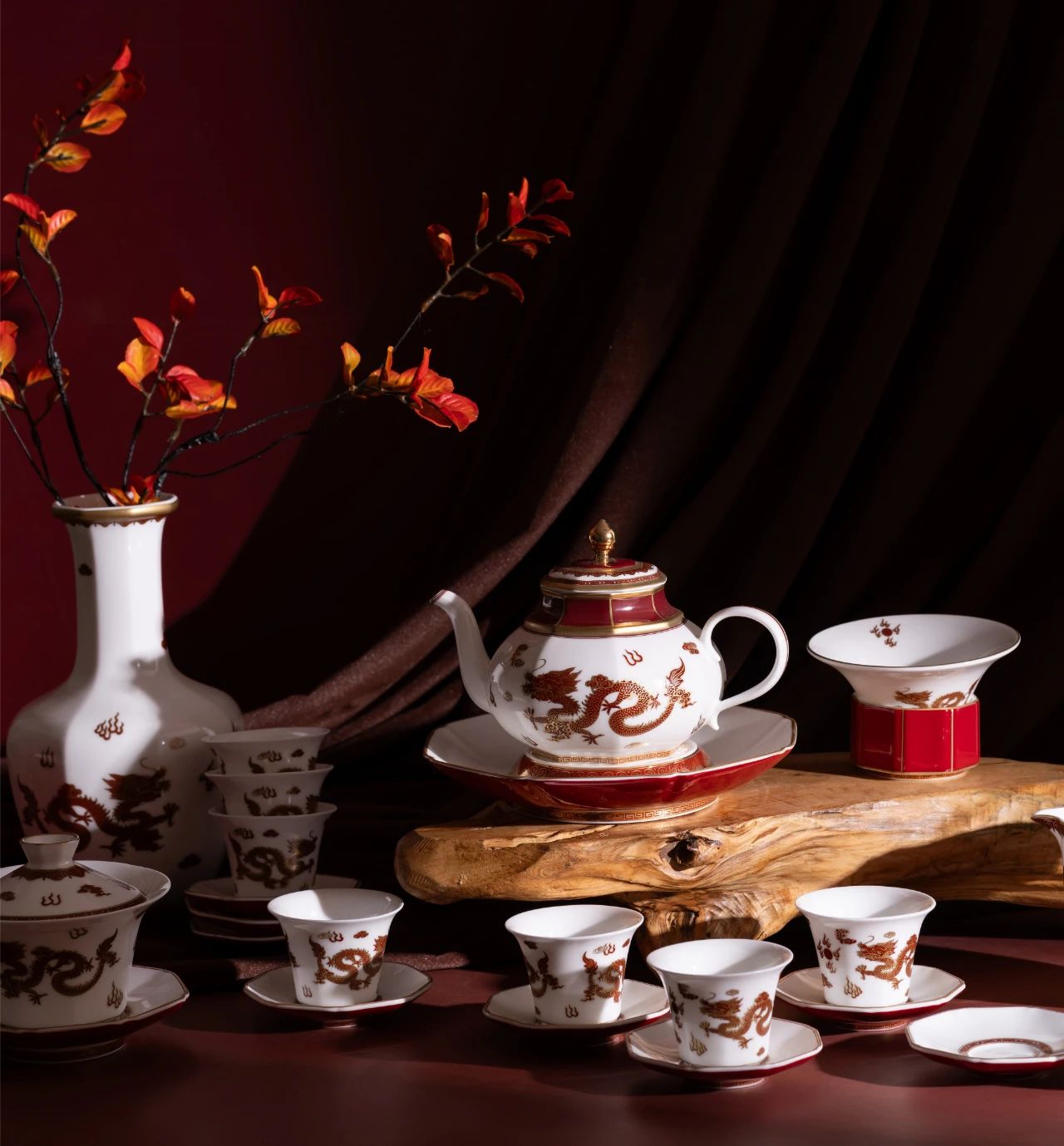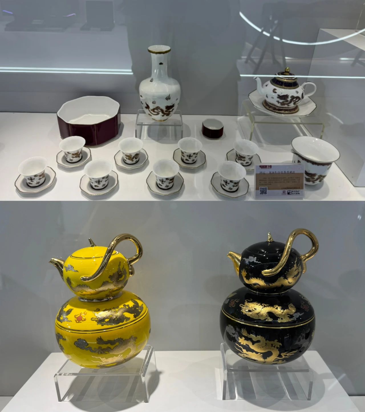 在江蘇展廳“首發(fā)首秀”板塊,由江蘇高淳陶瓷股份有限公司帶來的“九龍聚福系列茶具”和“鴻運(yùn)·龍28頭白依茶具”兩個(gè)系列骨質(zhì)瓷茶具,運(yùn)用手工描金和特殊琺瑯彩工藝,呈現(xiàn)出了傳統(tǒng)的中國韻味和當(dāng)代中國陶瓷工藝的最高標(biāo)準(zhǔn),既可以是擺件、又可以是茶具,吸引了不少觀眾駐足拍照。